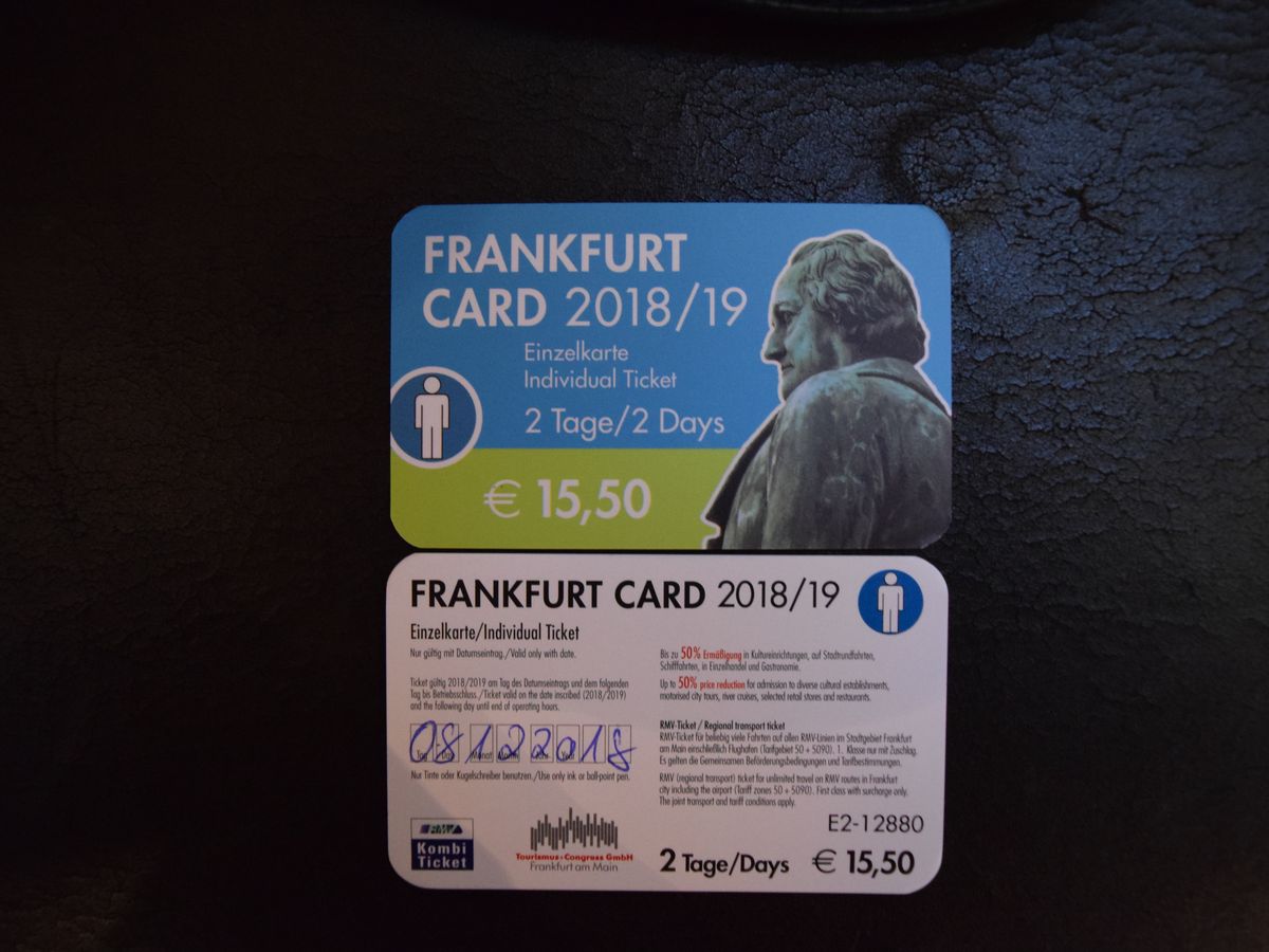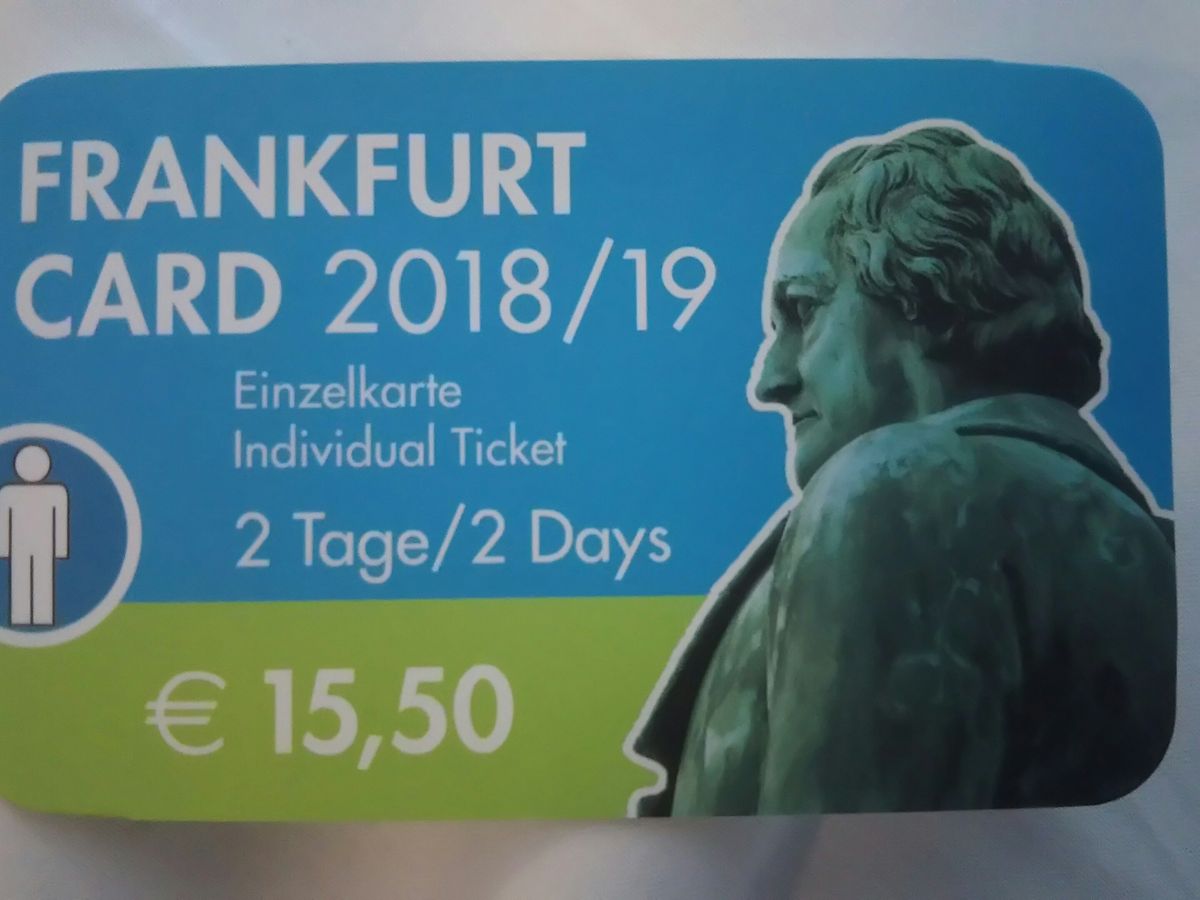 フランクフルト市内の乗り物はほとんど全て乗れて、いろんな施設が割引になるので、とても便利です。前にはマドリッドで同じカードぉ使ったことがあったので、行く前には絶対使おうと思って事前購入しました。