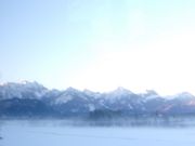 早朝にミュンヘン中央駅に集合してバスに乗車しましたが、移動中に夜明けを迎えた中、車内ではガイドさんが適度なタイミングで城の見どころや歴史について紹介して下さいました。予定よりも早めに到着したので、先にコロマン教会で停車するなど、柔軟な行程を組んで頂いたお蔭で、最終的にミュンヘン中央駅への帰着が予定よりも約1時間早まり、夕方以降も有効に時間を活用することができました。 城の目の前に広がるアルプ湖が凍