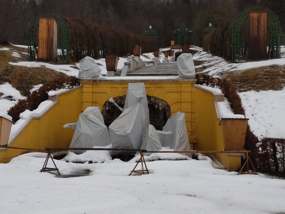 冬季は有名な噴水が閉鎖されていて(水抜き状態)、とても残念な景色でした。
