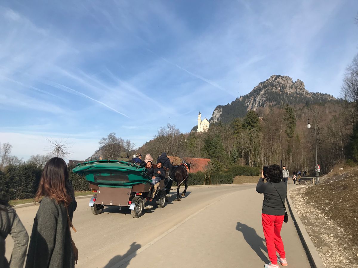 3月の初旬に参加しましたが、道にはまだ雪が残っていました。この時期にノイシュバンシュタイン城に行くためには、バス停から徒歩か馬車しかなく、馬車は行列ができており、非常に寒い中での登山or行列待ちを覚悟しないといけません。