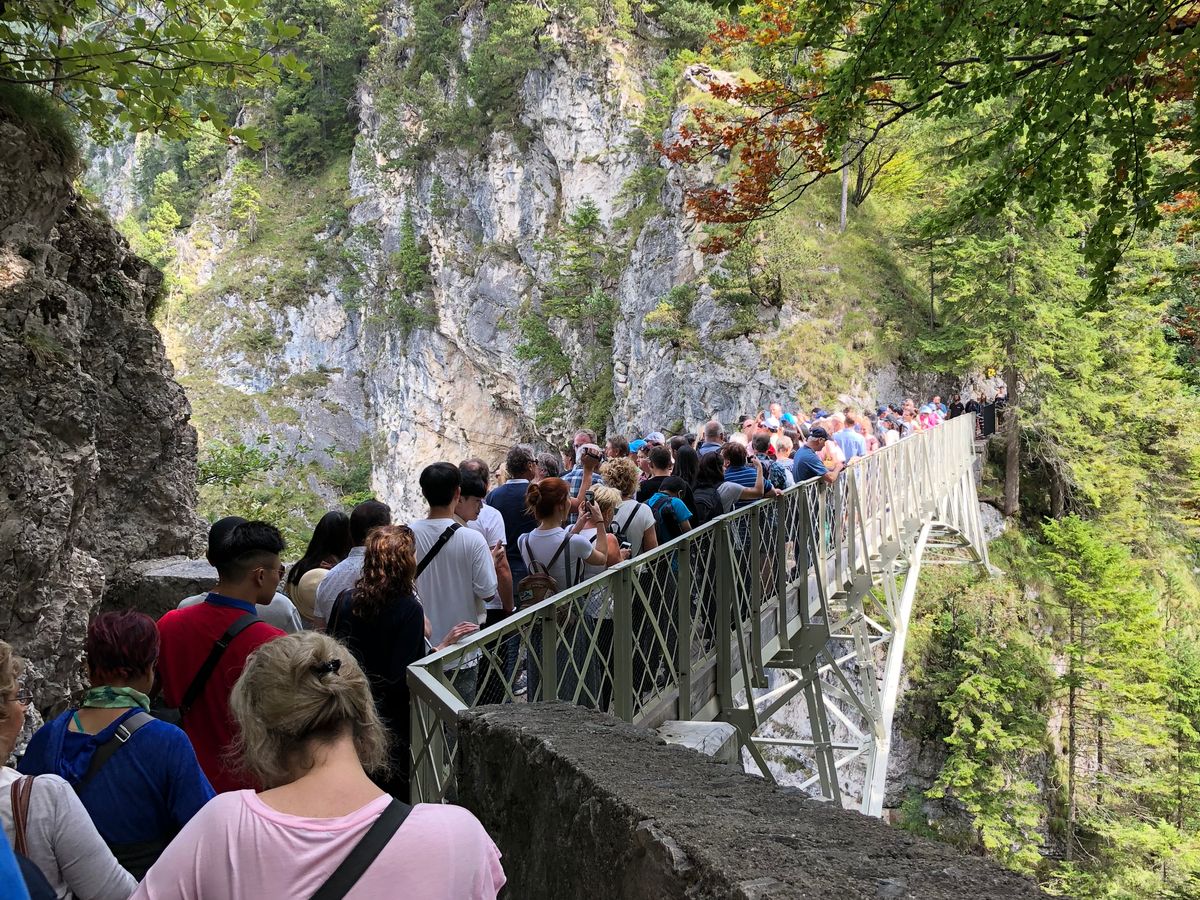 シャトルバスから降ろされた後、5分程度登ったらマリエン橋が見えてきます。ここで渓谷にそびえ立つノイシュバンシュタイン城が見れます。