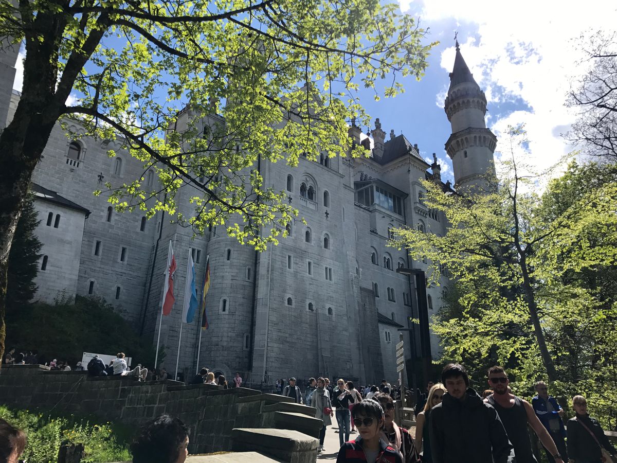 集合場所もなんなく見つけられ、出発もスムーズでした。ミュンヘンへはテニスのBMW オープンを観戦に行ったのですが、せっかくなので有名なノイシュバンシュタイン城を見ようと参加しました。さすがにGWなのでバスはほぼ満席でしたが、ミュンヘンの田舎風景やバスの音声ガイドなどもあり、道中もとてもよい観光ツアーになりました。バスを降りて各観光場所につくと、そこから自由時間になり、集合時間までにもどればよい、というとても自由なスタイルでそれもまた性にあいました。