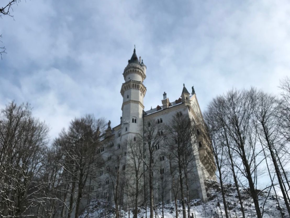 そしてノイシュバンシュタイン城。馬車は混雑していたため 徒歩で向かいましたが、ツアーバスから30分かからない程度で到着しました。人を寄せ付けたくないというルートヴィヒ2世の思いとは裏腹に、誰もが釘付けになるであろう真っ白で人目をひく大きな大きな古城。城内はリンダーホーフ城とは違い、落ち着いた印象を受けたものの、立派な天井に描かれる絵画や洞窟に圧倒されることばかりでした。