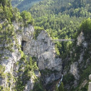 夏場は大変混み合うので、以前両親が訪れた際にお城の入り口まで行きながら時間切れで中に入れなかったと聞いていただけに、本当に中まで行く事が出来るのか、と少々不安でした。 今回のツアーでは途中リンダーホーフ城(日本語テープガイド有り)、オーバーアマガウの村に寄り、1時半頃にノイシュバンシュタイン城の麓に到着、3時半からの入場チケットでしたので、ゆっくりレストランで昼食を取り、バスでマリエン橋のたもとまで行けました。