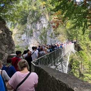 シャトルバスから降ろされた後、5分程度登ったらマリエン橋が見えてきます。ここで渓谷にそびえ立つノイシュバンシュタイン城が見れます。