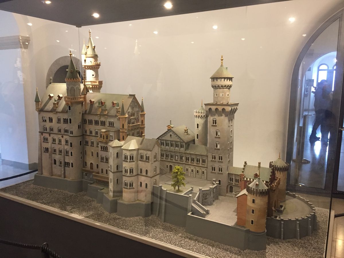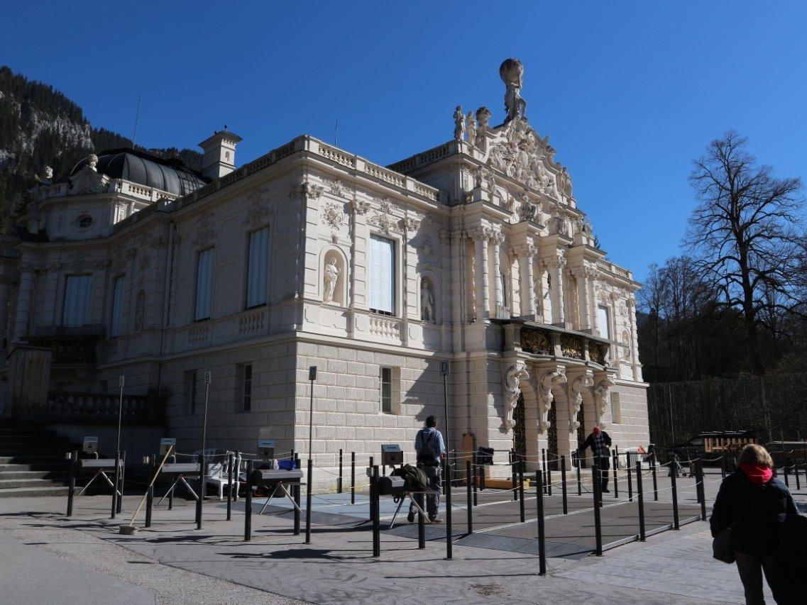 先に、リンダーホフ城を見学しましたが、小さいお城なのに豪華がギュッと詰め込まれていて見ごたえがありました。また、庭がきれいでも起伏があって足腰を鍛えてないとお城めぐりは、厳しいなと思いました。(そのほかのお城も階段や坂道や起伏がかなりあります。)次に、オーバーアマガウの村を見学しました。なぜ、家の壁に絵を描くのか説明もありました。最後にノイシュバンシュタイン城の見学です。