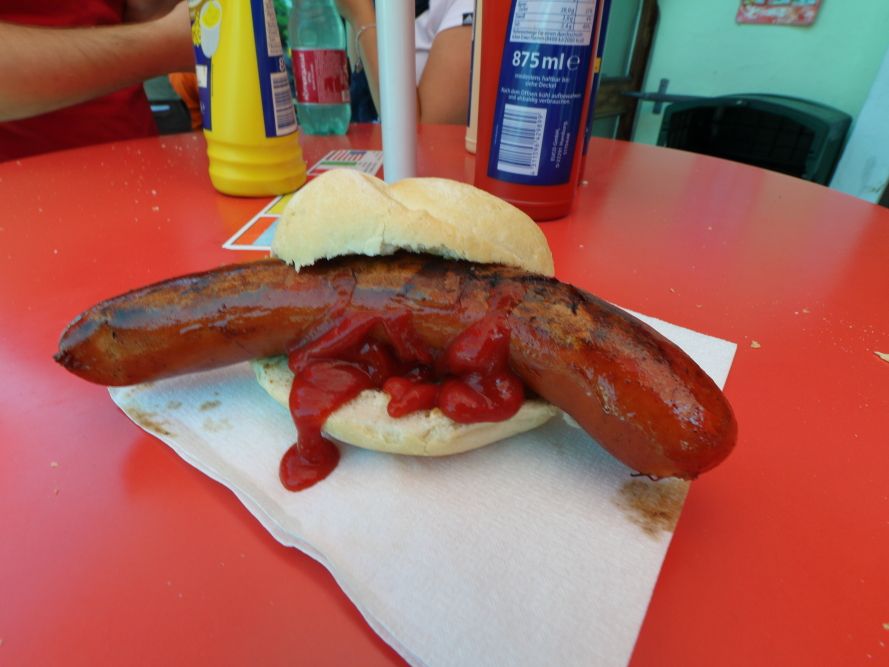 ランチを食べてから各自でノイシュバンシュタイン城の入り口に向かいますが、マリエン橋での写真撮影の時間を確保したかったので、レストランではなく売店でホットドッグ(3ユーロ)を購入し、店の前のテーブルでさっと食べ終えました。
