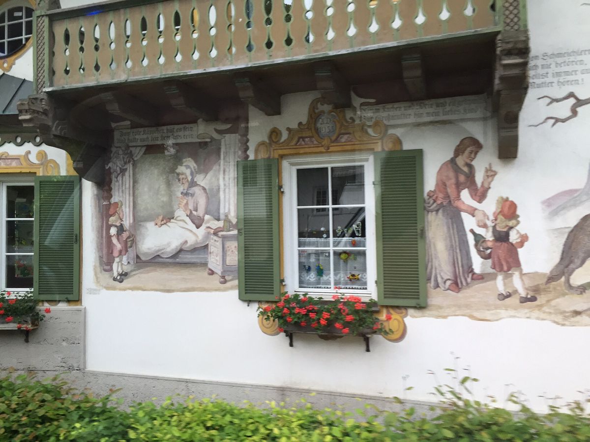 16:00。リンダーホーフ城に向かって出発。途中の町で「赤ずきんちゃん」や「ブレーメンの音楽隊」などの壁画を見る。バスはゆっくり走りシャッターチャンスを作ってくれる。これはツアーバスならではだ。