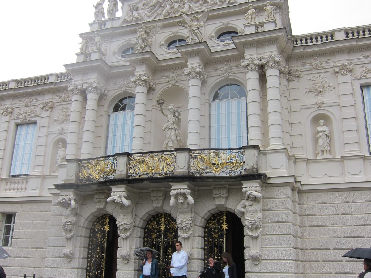 最終目的地はリンダーホーフ城です。生憎の雨でしたが、森の中を進むとこぢんまりとしたヴィラのようなお城が現れます。城前にある噴水を見た後、城内に入りました。