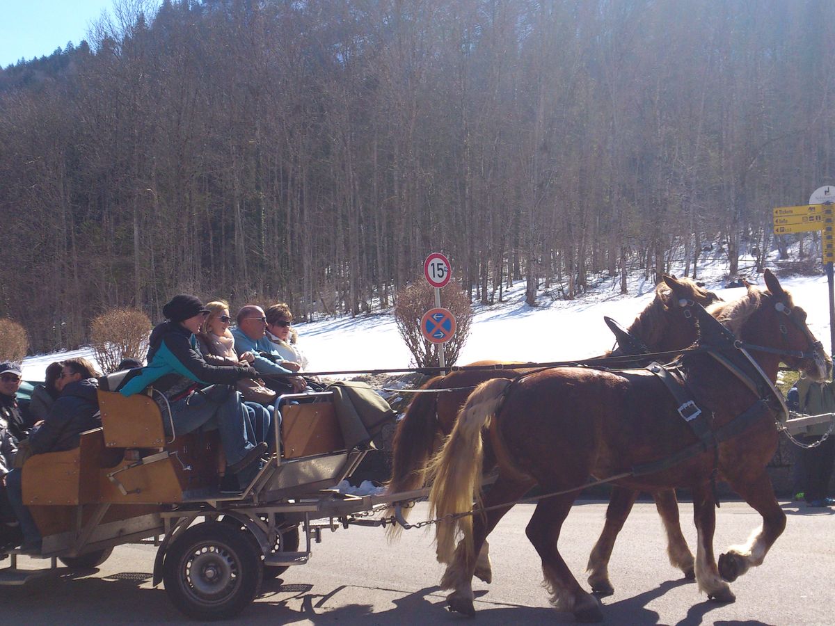十数年前夏に来たことがありましたが、冬は冬でまた違った美しさがありました。個人的に登っても、ガイドさんと登ってもいいとのことだったのですが、私達は早めに出発し、写真撮ったりのんびりと登りました。馬車は混んでいて、待っている時間を考えると歩いて登った方が早かったと思います。雪でだいぶ靴が濡れたので、冬参加の方は靴に気をつけてたほうがいいと思います。ガイドさんもいろいろとお話してくださり、個人で来るよりもとても勉強になりました。ほぼ日本語のできない旦那さんには30%程度しか訳してあげられず申し訳なかったですが、ノイシュバンシュタイン城の中はオーディオガイドだったので問題なく、結果的にとても思い出に残ったようです。