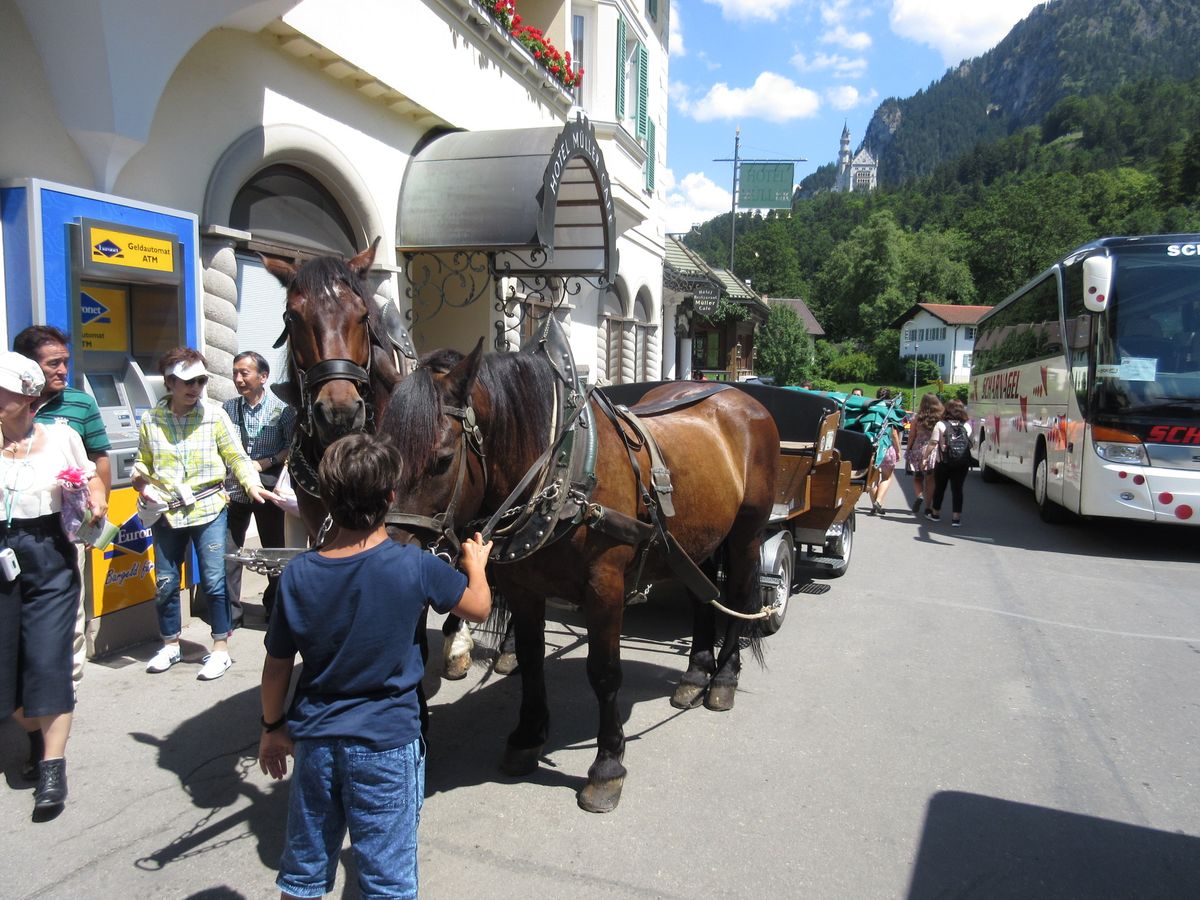 ノイシュバンシュタイン城ではお城まで行くのに、徒歩・シャトルバス・馬車の3通りがあり、自分で決めて行くのですが、ハイシーズンの馬車は長蛇の列で、しかも15~20分に1台ぐらいしか来ないので、待ち時間を考えないと結局入場時間に間に合わないことになりかねません。徒歩が一番確実かとおもいました(徒歩だと30分弱ぐらい)。また、城内でも階段を上ったり下りたりとけっこう動きますので、トータルの運動量はかなりのものになります!ですが、すばらしいお城です!