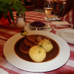 食べ物ですが、ニュンベルクの四角い広場にある豚の煮込みとパンがセットになっているものを食べました。名前はわからないですが、トマト味でとても美味しかったです。