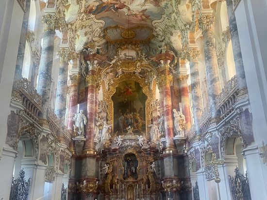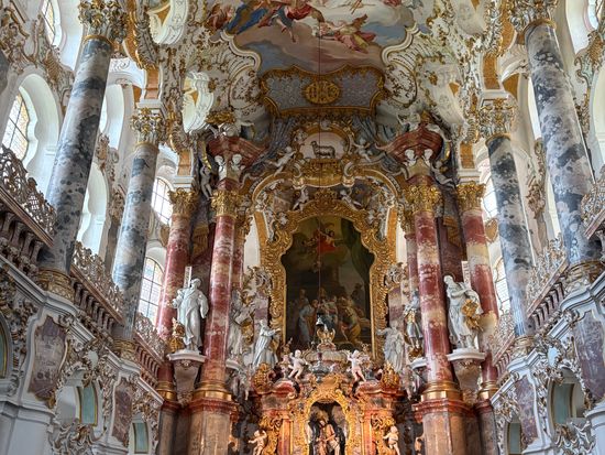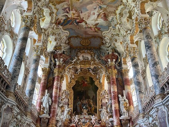 シンプルな外観とは裏腹に、一歩中に足を踏み入れると、色鮮やかな天井のフレスコ画と華やかな柱の飾りが見る者を圧倒します。1983年にはユネスコの世界遺産にも指定され、ロマンティック街道では、欠かせない観光スポットの一つになっています。