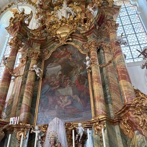 シンプルな外観とは裏腹に、一歩中に足を踏み入れると、色鮮やかな天井のフレスコ画と華やかな柱の飾りが見る者を圧倒します。1983年にはユネスコの世界遺産にも指定され、ロマンティック街道では、欠かせない観光スポットの一つになっています。