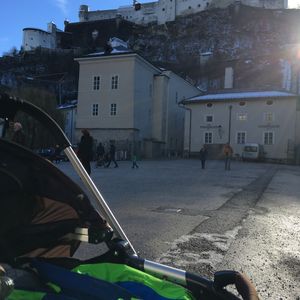 この日(12月中旬)は幸い天気に恵まれましたが、ザルツブルグはミュンヘン市内より寒く感じました。ベビーカーの息子にはスキーウェアを