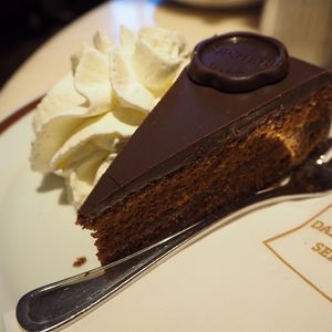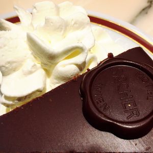 とは言え、橋を渡ったミラベル庭園はジュリー・アンドリュースが立った場所に確実に立てますし、その手前河沿いの一流ホテル「ザッハホテル」はウィーンの本家の系列で「オリジナル・ザッハトルテ」をウインナーコーヒーと冷えたボトルウォーターまでセットになって€15ちょっとで、深紅を基調にしたリッチ空間でモーツァルト気分で頂きました。料理と違ってすぐにサービスされるのが素晴らしい。