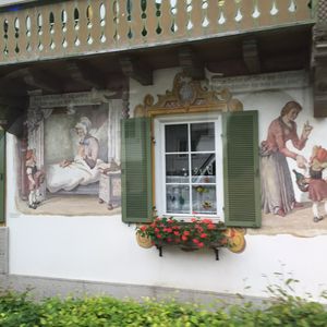 16:00。リンダーホーフ城に向かって出発。途中の町で「赤ずきんちゃん」や「ブレーメンの音楽隊」などの壁画を見る。バスはゆっくり走りシャッターチャンスを作ってくれる。これはツアーバスならではだ。