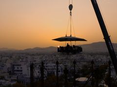 刺激的でスリルに満ちた一生忘れられない食体験!天空のレストラン「Dinner in the Sky」にて、おいしいギリシャワインと共に6コースディナーをご堪能ください。絶叫アトラクションのようなダイニングテーブルに着席し、いざテイクオフ!!