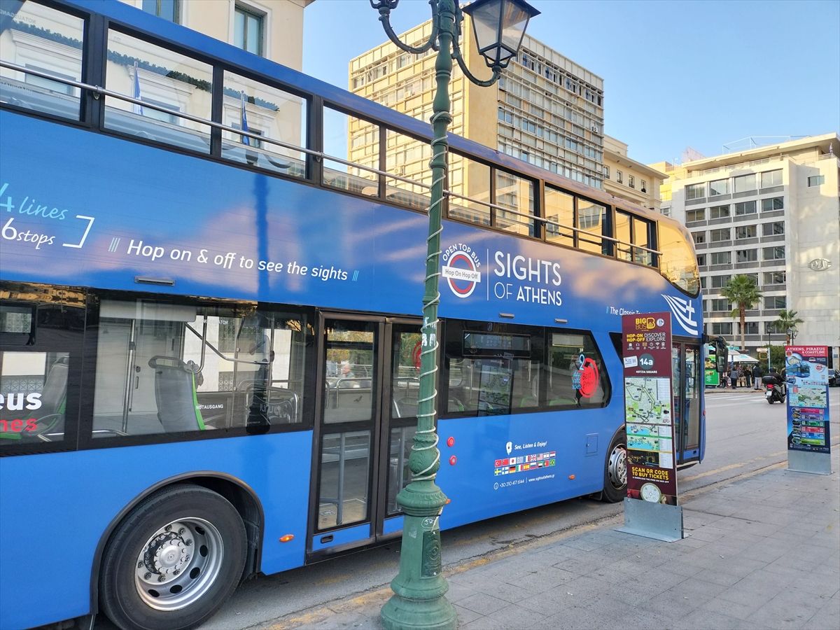 Monastiraki Squareの広場の停留所から乗りました。他社のバスも発着するので似たような係員が数人たむろしていますが、最初他社のひとに訊いたらすぐに教えてくれましたので問題なしです。