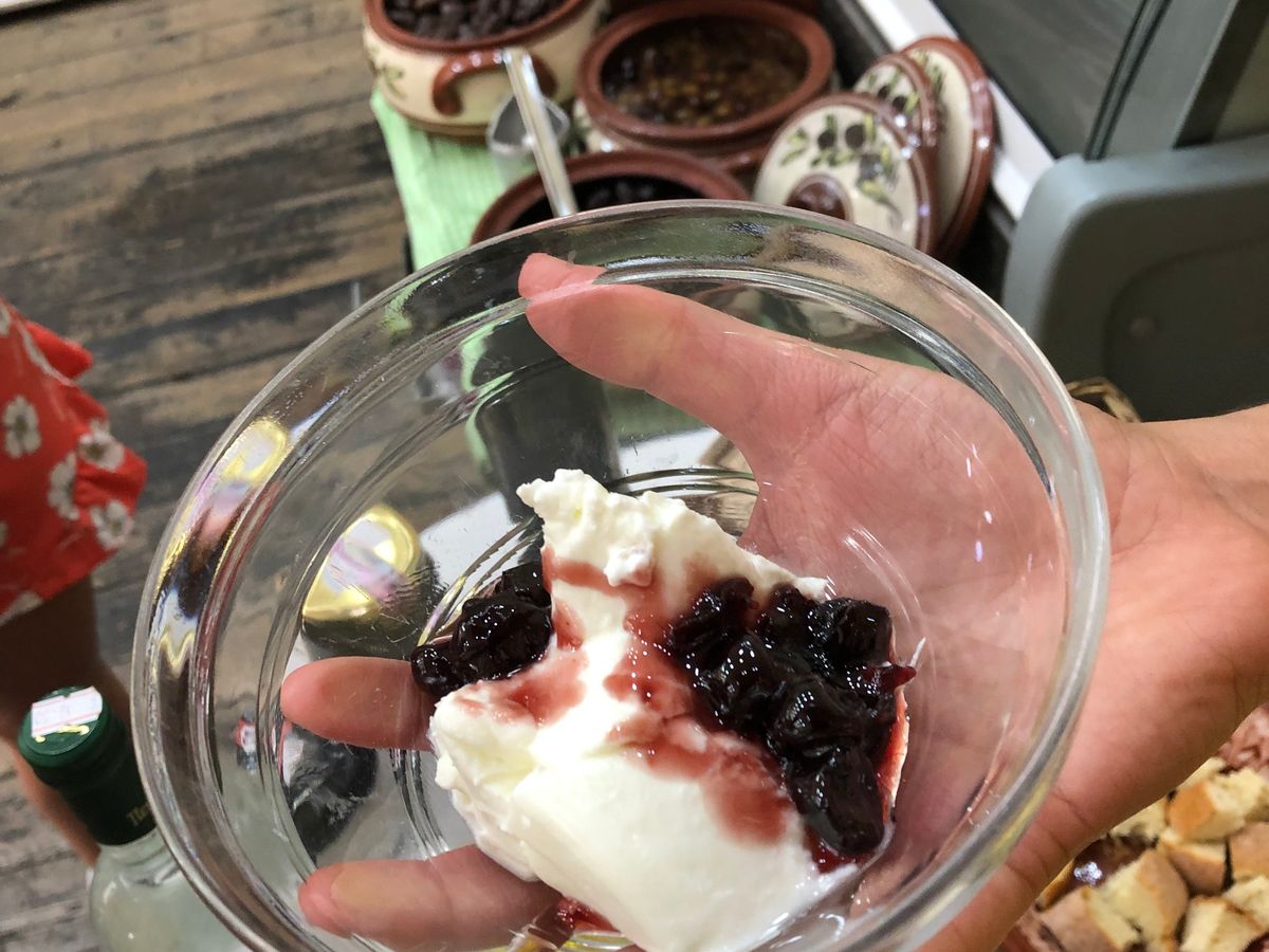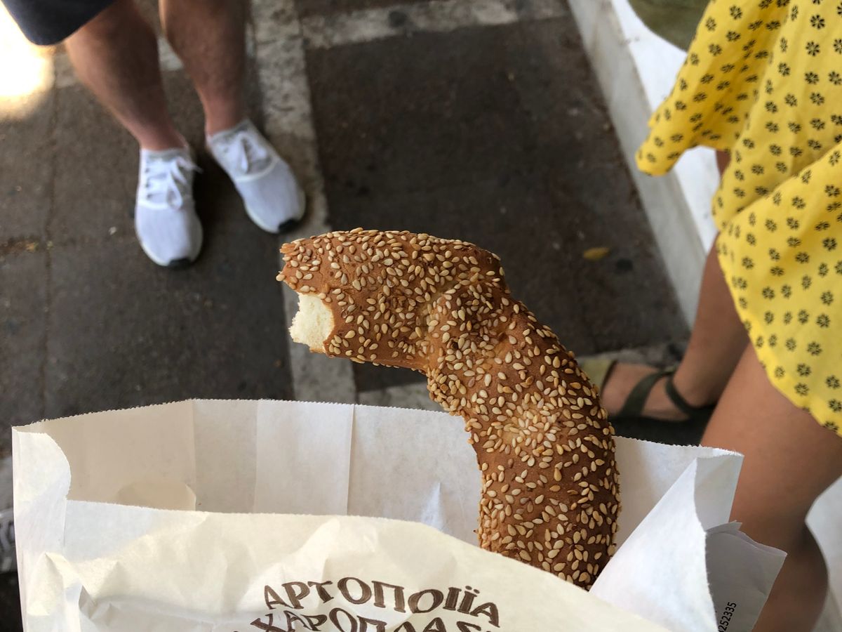 クルーリ(朝食パン)→Krinos(ドーナツ)→土産屋でオリーブオイル・オリーブペイスト・チーズなど試食→トルコ風菓子→チェリー→ひよこ豆・ザジキ・ズッキーニボール@レストラン→パストゥルマ(干し肉)→パイ→ギロピタ