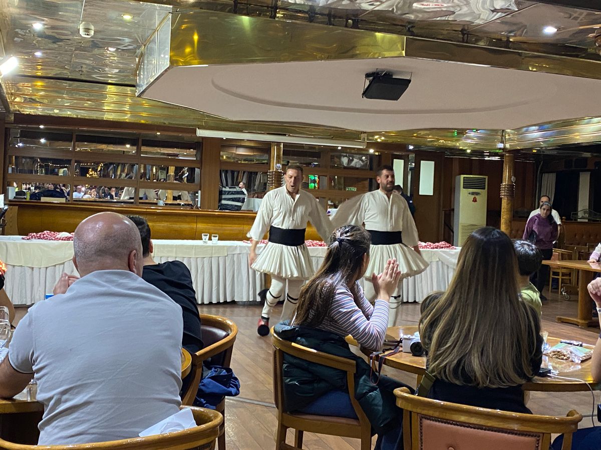 船上でのビュッフェは味付けもよく、満足しました。ギリシャ伝統のダンスも披露してくださり、エンタメとしても楽しめました。また、当日は日本人団体客が同乗していたため、日本語アナウンスもあり、聞き逃さずに済んでラッキーでした。