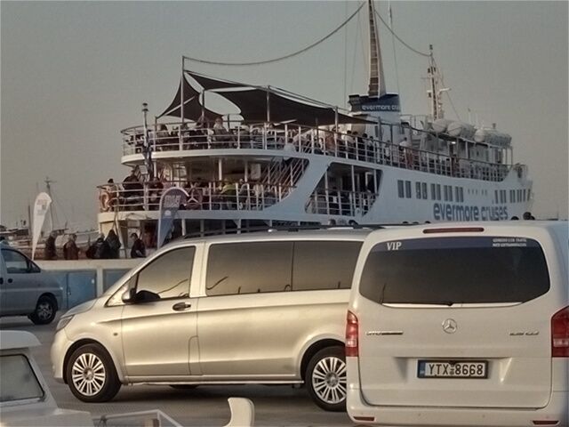 船への乗船は一番最後のグループ。席の確保等できない状態でしたので、乗船前、VIP席の販売をしていた女性を船内で探し、1人110ユーロのチケットを購入して、常時、アルコール以外、フリードリンク、10時前菜、13時3コースランチ、最初の島での島内観光付き、ベンツのバンでの各ホテルへの送迎付き権利を得ました。それから、各島から船に戻る際、長い列に並ぶ必要は無く、VIPリストバンドを見せれば優先的に乗船させてくれます。お陰で、ストレスの無い、お昼寝も出来る船旅と各島での観光を存分に楽しめるツアーとなりました。エーゲ海は、穏やかで空は青く、サントリーニに行けなかったのでプチサントリーニを味わえたようで参加して良かったと思えました。事前にチケット購入して無かったので、窓際のソファー席は満席で、固めの椅子のテーブル席になった事、行きのベンツのバンの送迎の権利が無かった事は、悔やまれます。