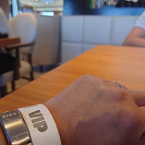 これが 静かで落ち着けて・・・ ( うるさいんだ、正式なランチのテーブルが! ) 島めぐりした後の乗船も腕の VIP バンドを見せるだけ。