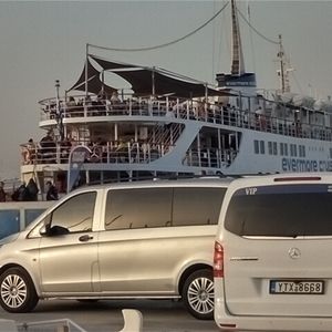 船への乗船は一番最後のグループ。席の確保等できない状態でしたので、乗船前、VIP席の販売をしていた女性を船内で探し、1人110ユーロのチケットを購入して、常時、アルコール以外、フリードリンク、10時前菜、13時3コースランチ、最初の島での島内観光付き、ベンツのバンでの各ホテルへの送迎付き権利を得ました。それから、各島から船に戻る際、長い列に並ぶ必要は無く、VIPリストバンドを見せれば優先的に乗船させてくれます。お陰で、ストレスの無い、お昼寝も出来る船旅と各島での観光を存分に楽しめるツアーとなりました。エーゲ海は、穏やかで空は青く、サントリーニに行けなかったのでプチサントリーニを味わえたようで参加して良かったと思えました。事前にチケット購入して無かったので、窓際のソファー席は満席で、固めの椅子のテーブル席になった事、行きのベンツのバンの送迎の権利が無かった事は、悔やまれます。