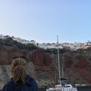 大きなヨットに15人ほど。6時間ほどのゆったりとしたヨットクルーズを楽しむことができました。カマリ地区近くのヨットハーバーから出港し、途中レッドビーチ、ホワイトビーチ、火山島で停泊。海に飛び込んだり、ヨットに残ってワインを飲んだり、みな思い思いの過ごし方。最後は夕陽の少し前にイアの湾に着き、沈んでいく夕陽や夕日に照らされたイアの街をぼんやりと眺めて。最高の形で「イアの夕陽」を見ることができました。