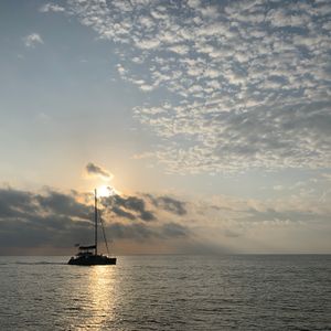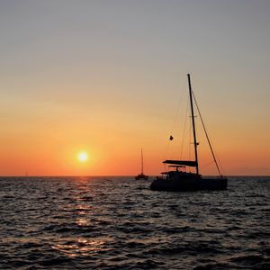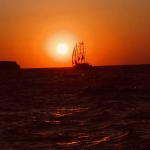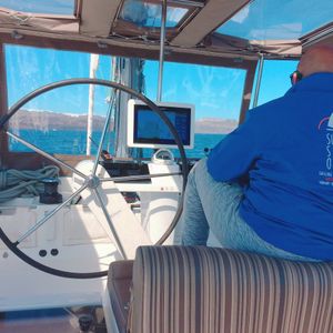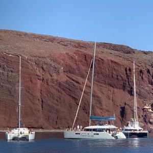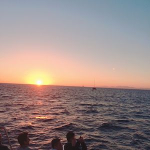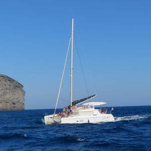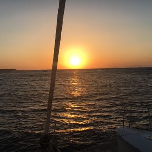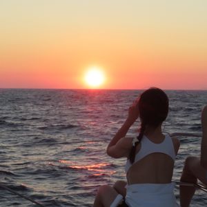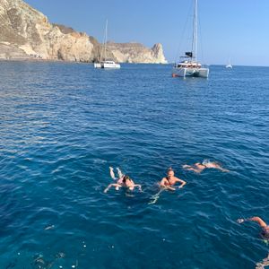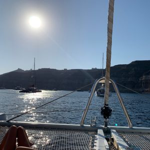 サントリーニ島 セーリングボートで夕日鑑賞しました。ワインも飲み放題、船上での BBQ デイナーも美味しかったです。エーゲ海に飛び込んで泳ぐ機会もありました。最高でした。