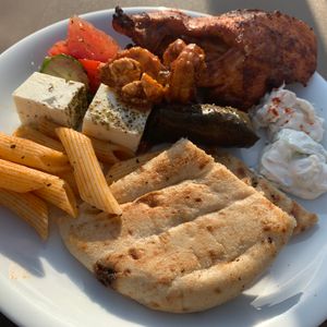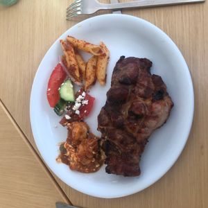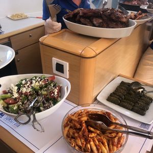 食事はビーチのあと出ました。ギリシャ風の料理と、乗船時にアンケートをとった肉料理。鶏胸肉か豚のステーキなんですが、豚が本当に美味しかったです!欧米人の方は本当に食事の量が少ないので、普通にとって食べるとちょっと恥ずかしくなりますね(笑)