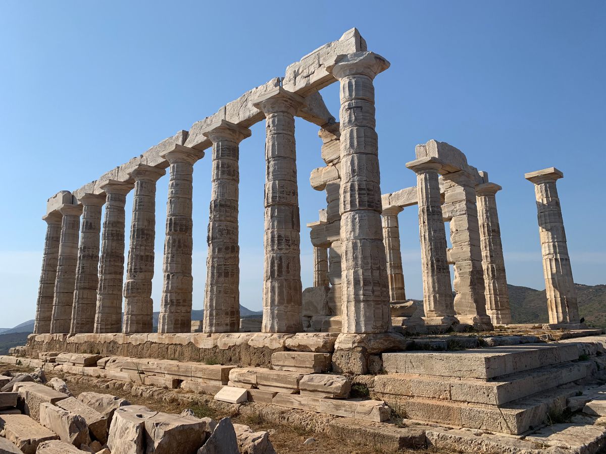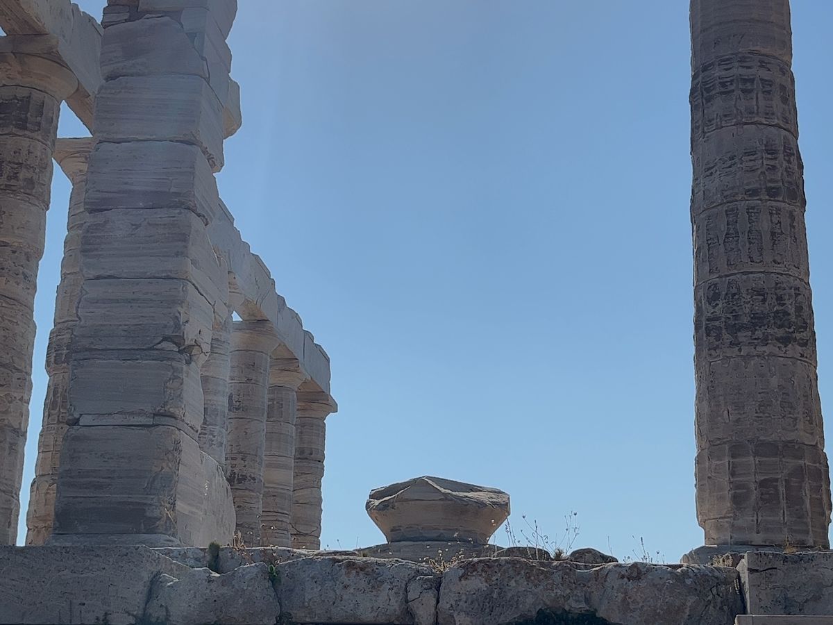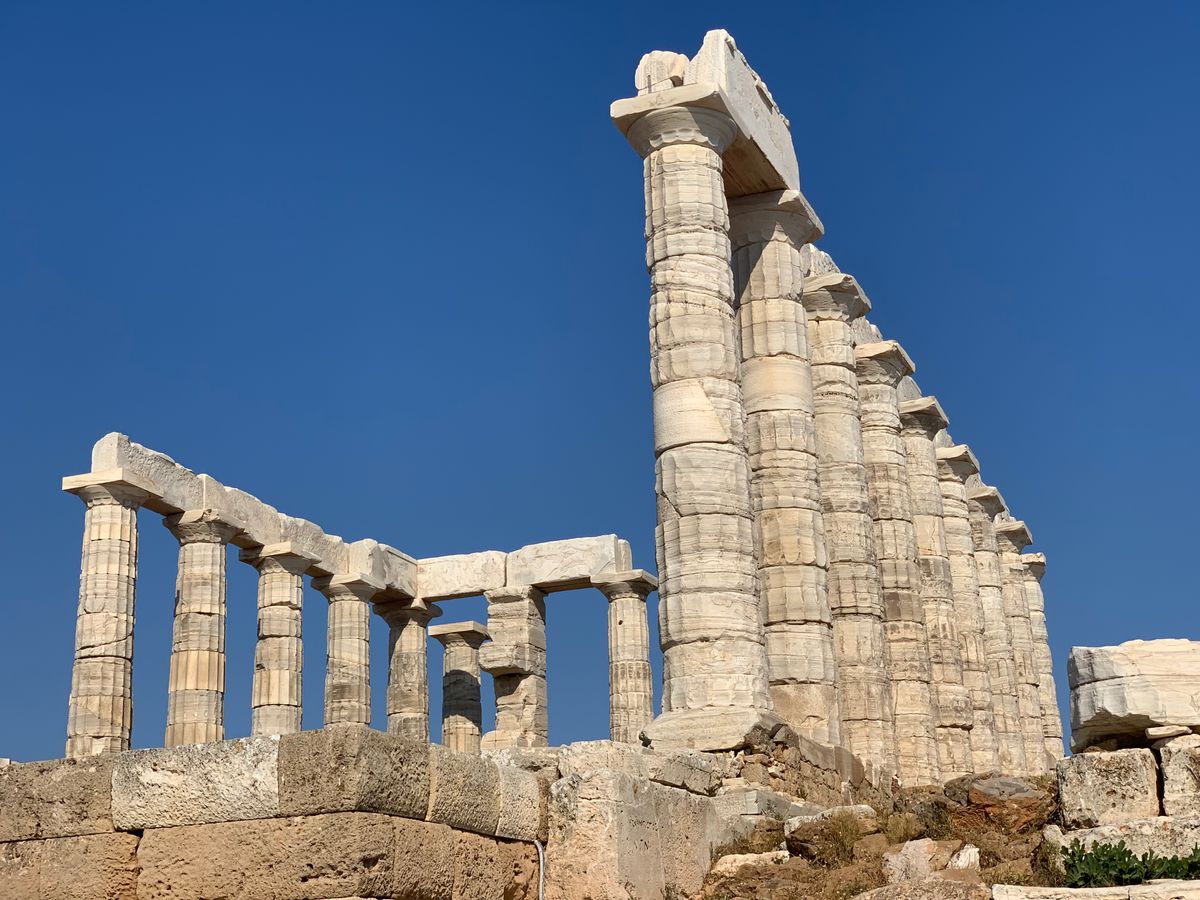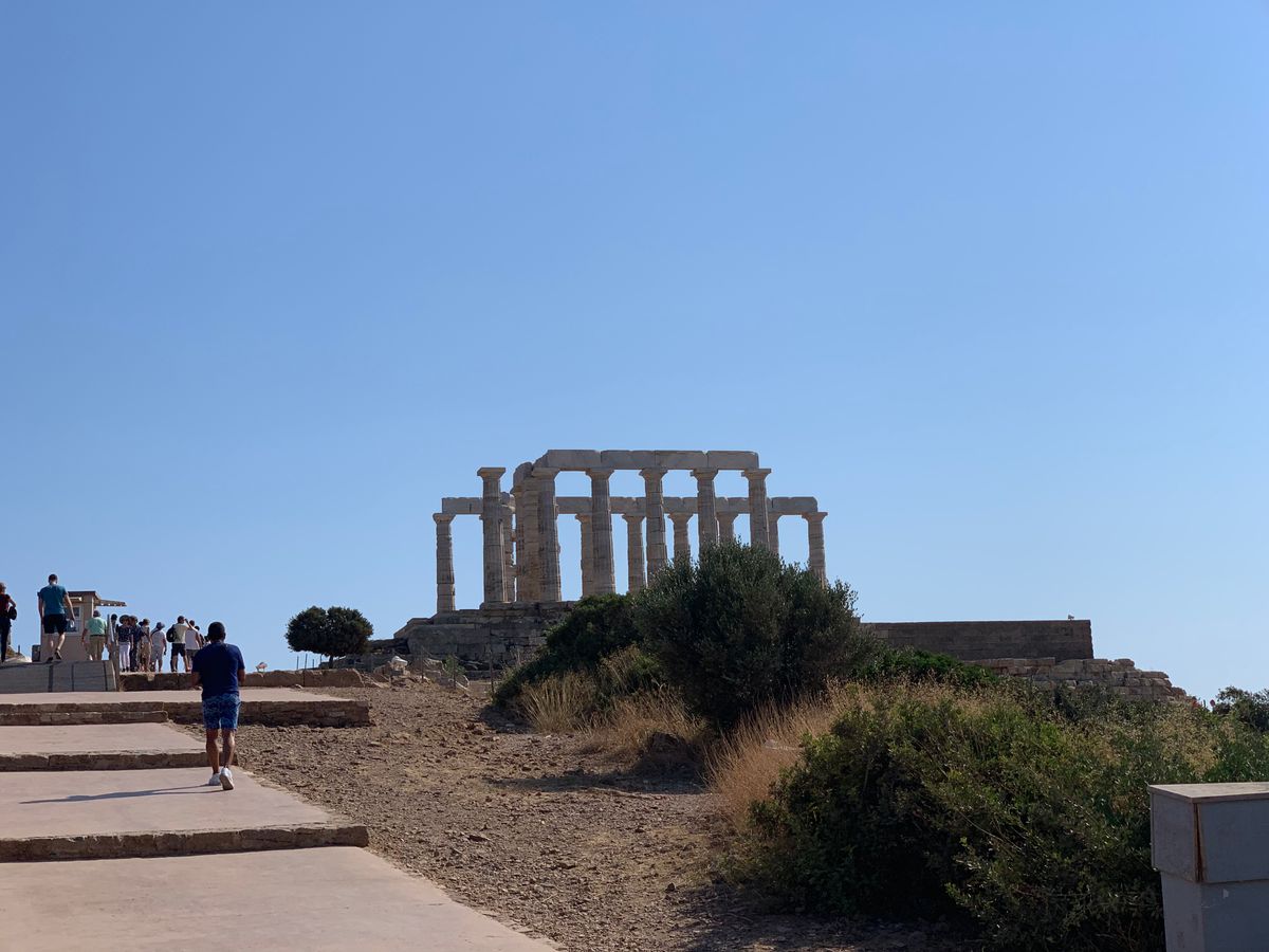 アテネ中心地から車で90分位の場所にある岬の先端なので、自然の広大さや、広い空の青さ、グリーンとブルーの海の美しさ、遠くに見える島々、そこにいきなりそびえ立つネプチューンの神殿は、爽快でした。