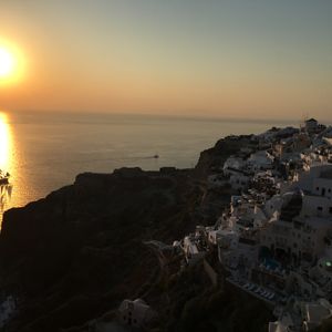 アテネからフェリーで島に渡りました。当初使う予定だったフェリー会社がストに突入したという連絡があったため、ストに関係のない会社がフェリーの臨時便を出してくれて、そちらを使いました。フェリーは大変混んでおり、席を確保するのも大変でした。行きは青い海を堪能できてよかったのですが、帰りもフェリーを使うのは時間がもったいないと感じました。もう一度行くならば、島での時間を多く使えるよう飛行機で行こうと思います。サントリーニ島のホテルで勧められてその場で申し込んだ、火山や温泉などのスポットを廻る船のツアーはとても面白く、充実した一日が過ごせました。ホテルからの眺めは本当に美しいです。特に夕日はエーゲ海を包み込むような壮大さがあり、太陽が水平線に届くまでずっと見ていても飽きません。街の夜景もきれいでお酒を飲みながら過ごすひと時は、まさに休日だなあと感じさせてくれる時間でした。