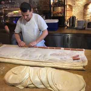 クルーリ(朝食パン)→Krinos(ドーナツ)→土産屋でオリーブオイル・オリーブペイスト・チーズなど試食→トルコ風菓子→チェリー→ひよこ豆・ザジキ・ズッキーニボール@レストラン→パストゥルマ(干し肉)→パイ→ギロピタ