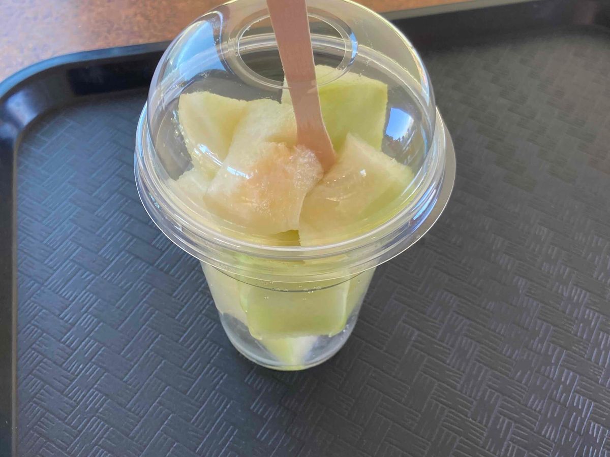 ランチは午後2時半近くになるため、朝ご飯をしっかり食べておいたほうが良いでしょう。あるいは行きのカフェでケーキっぽいお菓子かカットされたメロン?(写真)やスイカを買って食べるなどしましょう。