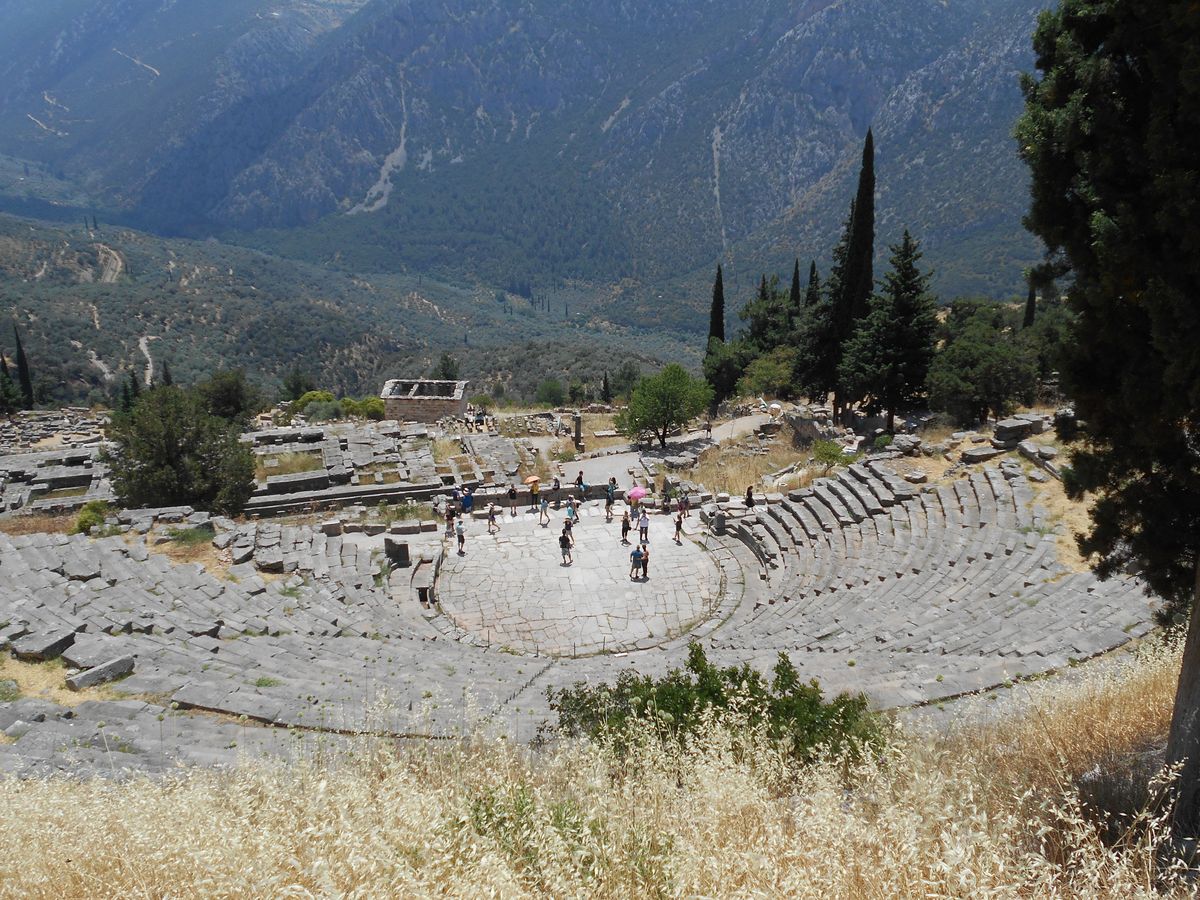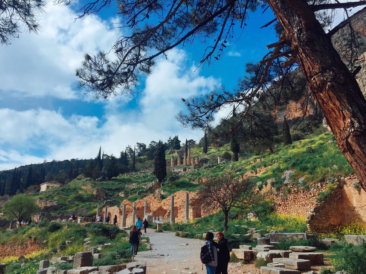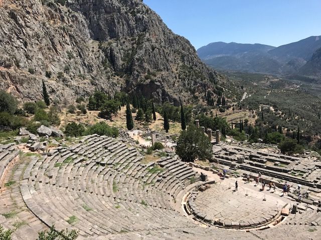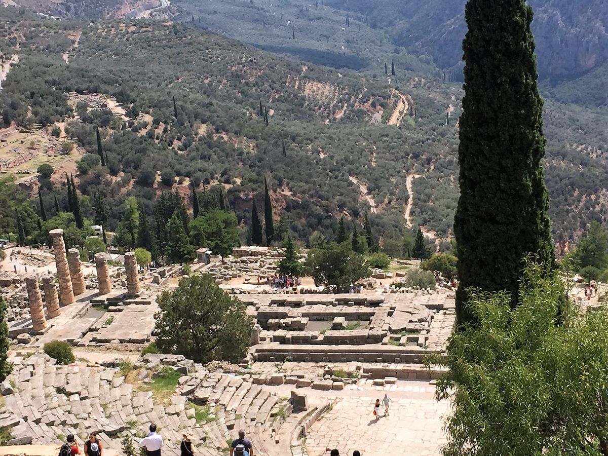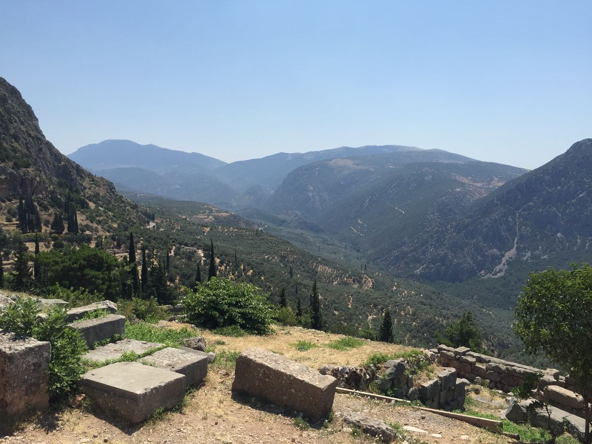 一日目のデルフィの遺跡。こんな高台にどうやって岩を運んだのか?と不思議な気持ちと大きな感動がありました。遠いアポロン神殿に人々が信託を受けに来ていたことをガイドさんから聞き、ギリシャ神話をもっと学びたくなりました。