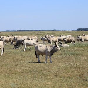 まず姿を現したのはスイギュウの群。続いて角が特徴的なハンガリー特有の灰色牛(マジャール・スルケ牛)。次いで独特の民族衣装に身を包んだカウボーイが馬に乗って登場。鞭の音一つで馬を「伏せ」「お坐り」など思いのまま、まるで犬のように操ります。次いで角の捻れたラツカ羊。最後に五頭立ての馬を一人の騎手が操るパフォーマンス。左右の脚をそれぞれ別の馬の背に載せての妙技に見学者一同大興奮でした。