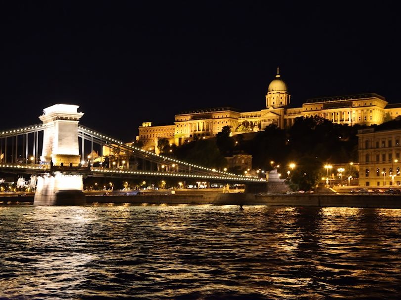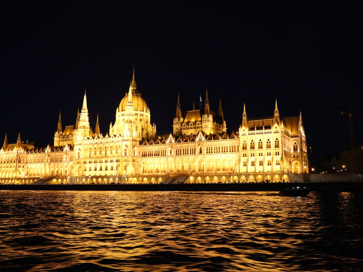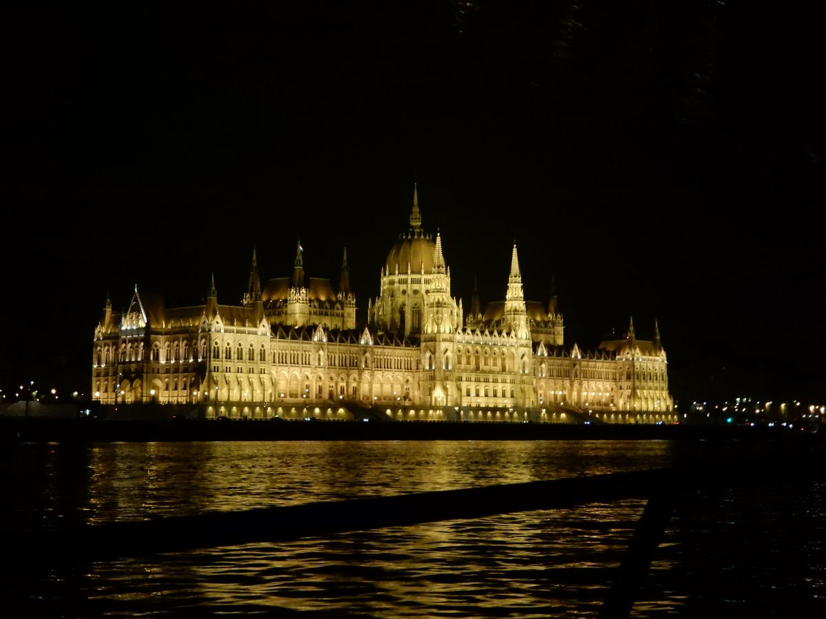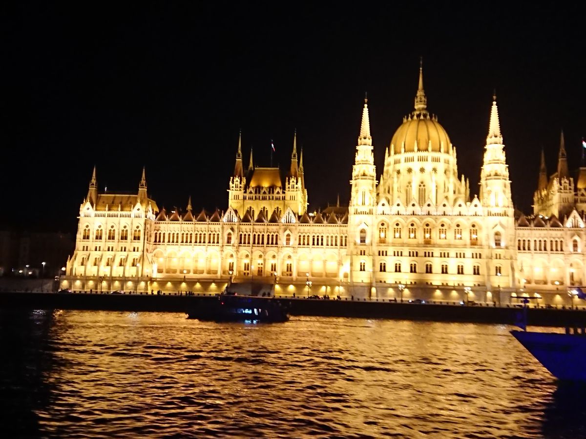 ドナウ川の夜景クルーズはディナー付きのプランもありますが、夜景を存分に楽しみ、写真に収めたいのであれば、やはりBeverageのみのプランの方がよいように思われます。ドナウ川をまず下流へ向かいユーターンして上流へ、マルギット島の下流でユーターンして船着場に戻るおよそ1時間弱のクルーズです。ブダペストの中心部を一往復しますので座席は左右どちら側でもよいですが舷側がマストですので是非確保するようにしてください。