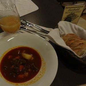 終わったら車でレストランへ連れて行ってもらいました。雰囲気の良い奇麗なレストラン。最初にグヤーシュ料理、次にメイン、最後にスポンジケーキのデザート(Somlói galuskaかな?)でした。グヤーシュとデザートがおいしくてメインをよく覚えていない。(笑)