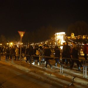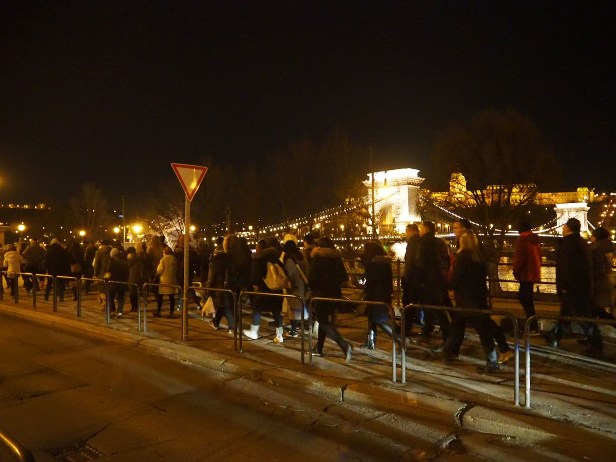 21:50頃、交換場所のスタッフの女性が「外に出てください。行きますよ」的なことを叫ばれ、みなさん動きます。とにかく外に出ましたが、先ほど上から降りてきた人達もいるので、ドナウ宮殿入り口前で立ち止まっている人や左右に歩いている人達がいる状態です。引率者とはっきりわかる人はいません。申し込み先毎に、引率者がロビーに来て、「みなさん行きますよ」的なことを叫んで一緒に行くのだと勝手に思い込んでいた私はどうして良いかわかりませんでした。中に戻りチケット交換場所のスタッフさんに尋ねます。「外に出て入り口前に居れば良いのよ」と言ってくれました。