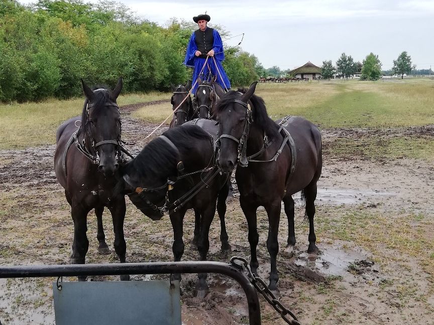まず姿を現したのはスイギュウの群。続いて角が特徴的なハンガリー特有の灰色牛(マジャール・スルケ牛)。次いで独特の民族衣装に身を包んだカウボーイが馬に乗って登場。鞭の音一つで馬を「伏せ」「お坐り」など思いのまま、まるで犬のように操ります。次いで角の捻れたラツカ羊。最後に五頭立ての馬を一人の騎手が操るパフォーマンス。左右の脚をそれぞれ別の馬の背に載せての妙技に見学者一同大興奮でした。