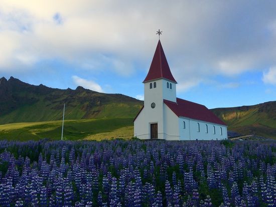 夏になると、ヴィーク村はルピナスの花で覆われる。