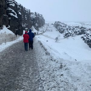 ここで終了組とゴールデンサークル組と別れます。ゴールデンサークル組は大きいバスに乗り換え、シンクヴェリトル国立公園で少しのガイドがあったあと一旦解散になり一同寒さの為ショップの中へ、ここで問題。普通は元降りた駐車場に戻るものですが麓の駐車場でバスが待機してあるのでそこまで自力で移動します。英語が拙いのと吹雪のせいで私は聞き逃してましたが、シルフラで仲良くなったカナダ人の女の子が「あそこにバスが見えるでしょう?そこまで歩いていくんだって!」と教えてくれました。これは注意して聞いてないと分からない!案の定、中国人の女の子二人組(英語もちゃんと分かる)が一向に来ず、スタート地点付近でピックアップされました(良かった)。次のグトルフォスの滝もまさかの集合場所移動!カナダ人の子とはぐれたので、やらかしました。元いたバスが無いのです(当たり前)置いてかれた?!と焦って歩き回ってると心配した参加者の面倒見の良い一人参加のお爺さんが探しに来てくれました!!(涙)落ち込む私を励ましてくれ(本当に申し訳ないです)次のゲイシール間欠泉は移動はありませんでした!(中国人の子が今度は移動ないよね?!と念入りに確認してました、笑) 途中、ファームに寄って馬の餌やりができたり充実した一日でした!ただ、集合場所は注意です!笑