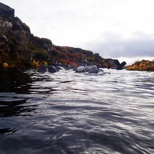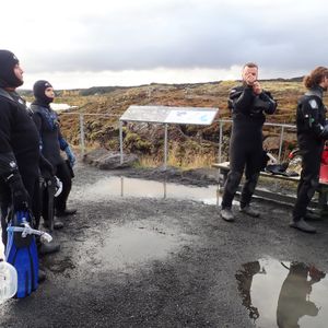 その後メインであるシンクヴェトリル国立公園の駐車場へ。洞窟ツアーに参加する人たちを残し、違うバンに乗り換え、そこでメディカルチェックフォームの記入。私は事前に書いてあったのを渡し、外に出てドライスーツに着替えるところでちょうど雨が降ってきて、全員濡れながら着替えていきました。服装によっては下に着るものも貸してくれるようですが、めんどくさい人は上下ヒートテック的なものを来ていった方がいいです。雨に打たれながらインストラクターに手伝ってもらいながらなんとかドライスーツを着用。気温も下がってきていて、雨の中着替えるには結構時間もかかり正直辛かったです。フィンなどの装備を受け取ってルートの説明を受け移動。上から見ると何てことない小川にスタートポイントが設置されていて、そこから入水。水温は常に2℃と聞いてはいたけど、ドライスーツ素材ではない頭部分と手は冷たい。意を決して浮かんでみると数10メートルある底まで見える透明度で一気に寒さを忘れました!見たことのない景色♪ドライスーツの浮力で浮いてるだけだけど、フィンが使いにくく、結構慣れるまでに時間がかかりました。しかも雨だからシュノーケルに水がたまるので水抜きが必要でした。20~30分くらいプカプカ浮かんで移動しながらみる風景は場所によって異なり全然飽きない!でも最後には顔の感覚がなくなりました(歯医者で麻酔した感じ)。駐車場まで歩いて戻って、着替えて元のバンへ。ホットココアとビスケットをもらって、最後は国立公園を上から見渡せる場所へ行って終了。よく写真でみる遊歩道のようなところには行きません。最後の方にシュノーケリングなので(その時々によって違うのかも?)メイク落ちとかは気にならないけど、髪は濡れるのでタオルが必要です。