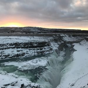 グトルフォスの滝は、雪のため一面が白く、晴れた青空とのコントラストがとても美しかったです。