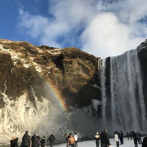 スコァガフォス:こちらも大迫力でサーリャランスフォスとは異なる魅力がありました。日光が差し込んで虹が出ていて最高でした。