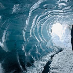 氷の洞窟は天候によっても入れる洞窟は日替わりのようですが、ツアー写真にあるほど大きい(長い)洞窟ではありませんでした。入り口〜突き当たりまで10〜15m程度でしょうか。それでも、突き当たりまでまで行き振り返ってみると綺麗な青の洞窟で、感動的でした。