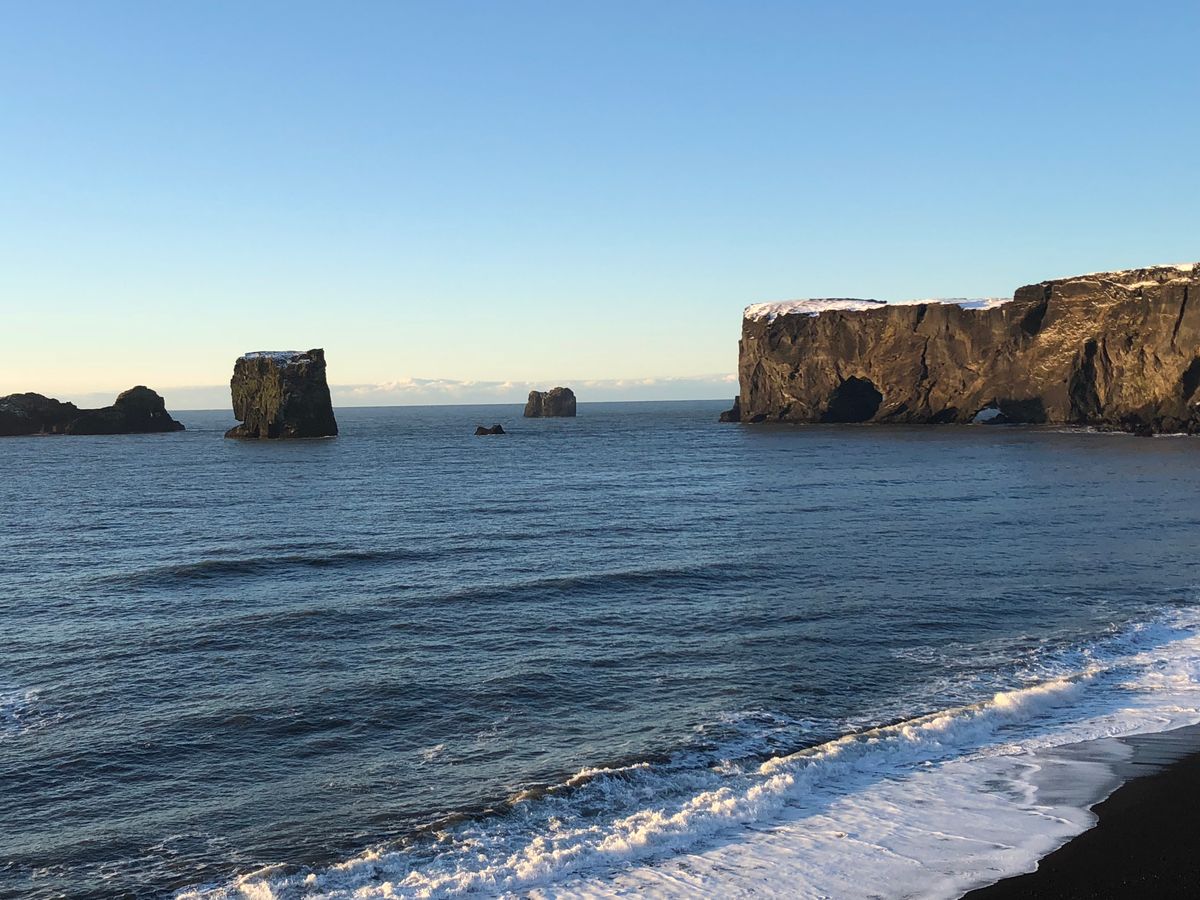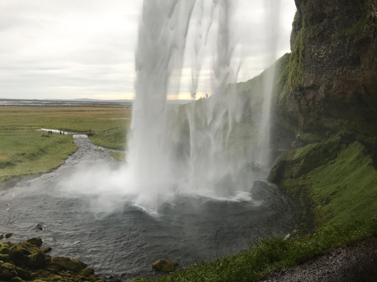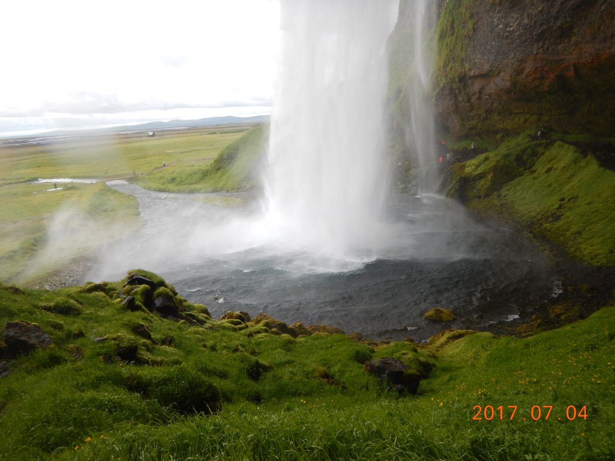 遠くの奇岩が見えるただの黒砂ビーチ。その後滝の裏側でびしょ濡れになり見学ポイント終了。