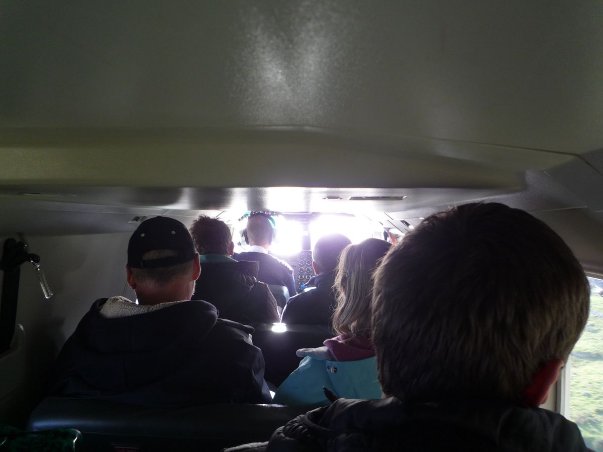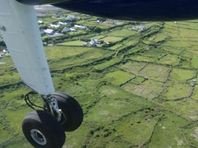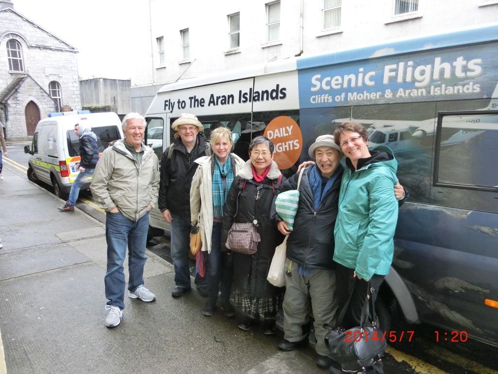 ヒューストン駅に7:00集合、ということで駅前ホテルのアイリッシュブレックファーストをあきらめて出かけると−実は久しぶりに日本人に会えると勘違いして出かけると、完全にアウェー。それまでもアウェーだったので、まあいいかと引率の黄色いジャケットを追いかけて列車に乗った。車窓に広がるアイルランドの田園風景は、文句なしに素晴らしかった。私は見落としたが、野ウサギがいたとか。荒れ地もあるネと思ったら、ピート(泥炭)だった。黄色いジャケットの旅ガイドの英語は早口でモゴモゴ、テーブルが標準装備の列車の、向かい席の中年ご夫妻(ちなみにこちらは共に古稀)に「分かりません」と訴えると、とても聞き取りやすい英語で、内容を要約して通訳してくださった。旅は道連れ、道連れはガイドのおかげ、ご夫妻にガイドの通訳をしていただいているうちにゴールウェイに到着、旧いベンツのバンに30分ほど乗って飛行場に向かった。体重を量って座席を決めるという10人乗りの双発機が、実は妻にとって、このツァー第二の眼目だった。250馬力×2くらいのピストンエンジンは一発で始動、アスファルト簡易舗装の滑走路をガタガタ滑走すると、15分間ほどの快適なフライトが待っていた。