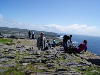 【要旨】学会が始まる前の1日を使って憧れのアラン島に行きました。別の書き込みでは、ゴルウエーの町は車窓からということでしたが、僕らは、帰りに1時間半の散策時間がありアイリシュバーにも寄りアイルランド音楽の生演奏を楽しむことが出来ました。【出発】タクシーでヒューストン駅に指定の5分前の7時10分着。別の書き込みにもあるように黄色いジャケットを着た担当者が、僕の名前が書かれた栞を持って改札口の前のホールで待っていました。この、もと一流ホテルのコンシェルジュだったB氏と一緒に列車でゴルウエーに向かう。途中、アスローンでお向かいの列車に乗り変える。ゴルウエーで、現地発のカリフォルニアとトロントからの2組の夫婦と合流。ヴィクトリアホテルの前で待つことしばし。飛行機会社のマイクロバスがやってきて、和気藹々と空港に向かう。小さなコネマラ空港で体重測定して座席を決める。セスナの中は鮨詰。でも飛行時間は8分。【アラン島到着】降りると同僚とはゲール語で話すドライバーの車に乗り、チャンビル・バニンの半分埋まった教会や9~15世紀に建てられたという島の反対側のナ・ショフト・ジャンビルを下車して見学。車中、古い民家や、ヤギ、牛、馬、海で死んだ漁師の墓、映画「アラン」の民家(今はB&B)などを見ながら、メインのドン・エンガスに向かう。【ドン・エンガス】登山口のキルマーヴィー村でマイクロバスを降りてヴィジターセンターを経て山道を20分くらい上る。妻は、ちょっと膝の具合が悪くて軽いビッコを曳いていたので、一寸心配したが、問題なくドン・エンガスまで到達した。天気は、快晴・雨・曇・強い西風(偏西風)と目まぐるしく変わる。匍匐前進で崖淵まで行き、90m下の大西洋の荒波を見る。絶壁に美しい花が咲いているのが印象的。1時間くらいで往復。【ティヤック・ナン・パディ】戻ってきたところにある唯一の村の食堂の名前がこれ。地球の歩きかたにも出ている。ここで食事。アイルランドの田舎料理が満喫できる。勿論、値段も田舎の食堂級。記念に、機械編みは承知の上で39.98€のアラン編みセーターを買う。これでも、ダブリンまで行くと50€はするだろう。約2時間ドン・エンガスとその麓で時間がありゆっくりできた。【帰路】帰りはもと来た道を走りキルロナン村に戻り、アランセーターセンターなどで買い物の時間がある。ここのセーターは、さらに安く35€くらいだった。来た時と同じ道をゴルウエーまで戻る。ここで別れるが、もう同行の客とは旧知の友人のよう。別れを惜しむ。【ゴルウエー観光】下車したところからすぐのエア・スクエア・センターに入り、ウインドショッピング。建設中に見つかったという店内の古い城壁などを見る。裏口から賑やかなショップストリートに出て、土産物屋に入り買い物をして、ついでに今の時間、生演奏でアイルランド音楽を聴けるバーを教えてもらう。すぐ先のTaaffysという店だ。入り口の角の席で4~5人の音楽家が演奏している。妻は、アルコールは駄目だがコーヒーも出してくれるし子供連れの客もいる。帰りの列車の発車時間まで余裕で音楽とギネスを楽しみ店を出る。駅まで、ストリートミュージシャンやリンチ家の城や聖ニコラス教会を見ながら戻る。約束と違って、駅の待合室には時間になっても誰も現れないので、改札口のほうに行ったら駅員が黄色いジャケットが首を出している列車を示す。待合室に戻り、妻と列車に乗り込む。帰りは乗り換えなしでダブリンへ。タクシーでホテルに戻ったら午後10時をちょっとすぎていた。【結語】時間がない人間には、たった一日でアラン島とゴルウエーを堪能できるツアーだと思います。料金も、地球の歩き方によると汽車賃が片道36.10€、飛行機代が往復45€となっているので、色々なその他のサービスや手間を考えたら、絶対、安いし、お勧めだと思います。